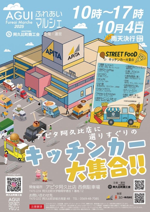 10月4日(土)、アピタ阿久比店駐車場にキッチンカーが15台大集合!阿久比町商工会が主催する特別イベントです。多彩なグルメが一度に楽しめる絶好のチャンス。お子さまから大人まで、家族みんなで楽しめる内容となっています。阿久比町の魅力を味わいに、ぜひお気軽にご来場ください!
